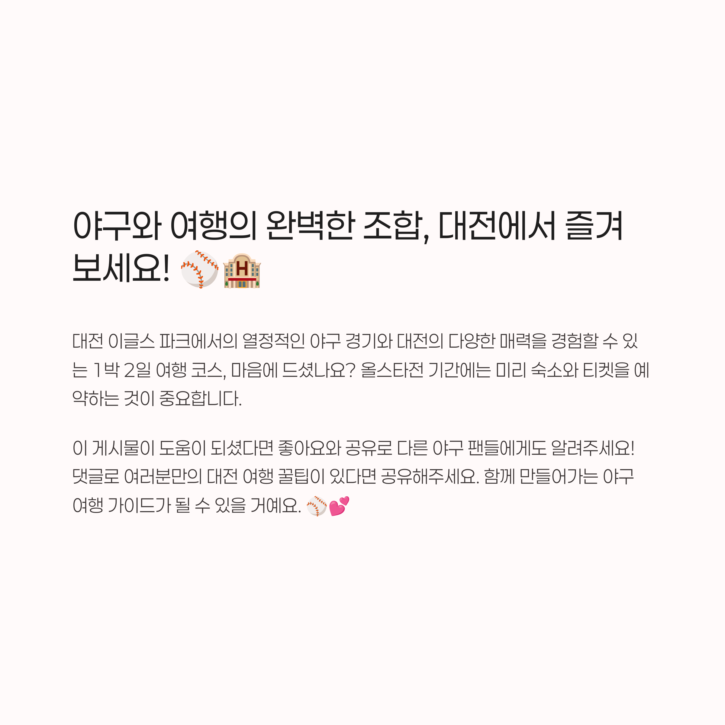 볼파크 주변에는 다양한 숙박시설과 관광지가 조화롭게 어우러져 있어 야구 관람과 함께 대전 여행을 만끽할 수 있어요. 도보 1분 거리의 가까운 호텔부터 프리미엄 리조트까지 다양한 선택지가 있으며, 한밭수목원과 같은 자연 명소, 성심당과 중앙시장 같은 문화 및 쇼핑 공간도 인근에 위치해 있답니다. 이런 편리한 입지 덕분에 야구 관람객들은 경기 전후로 풍성한 여행 경험을 누릴 수 있어요.